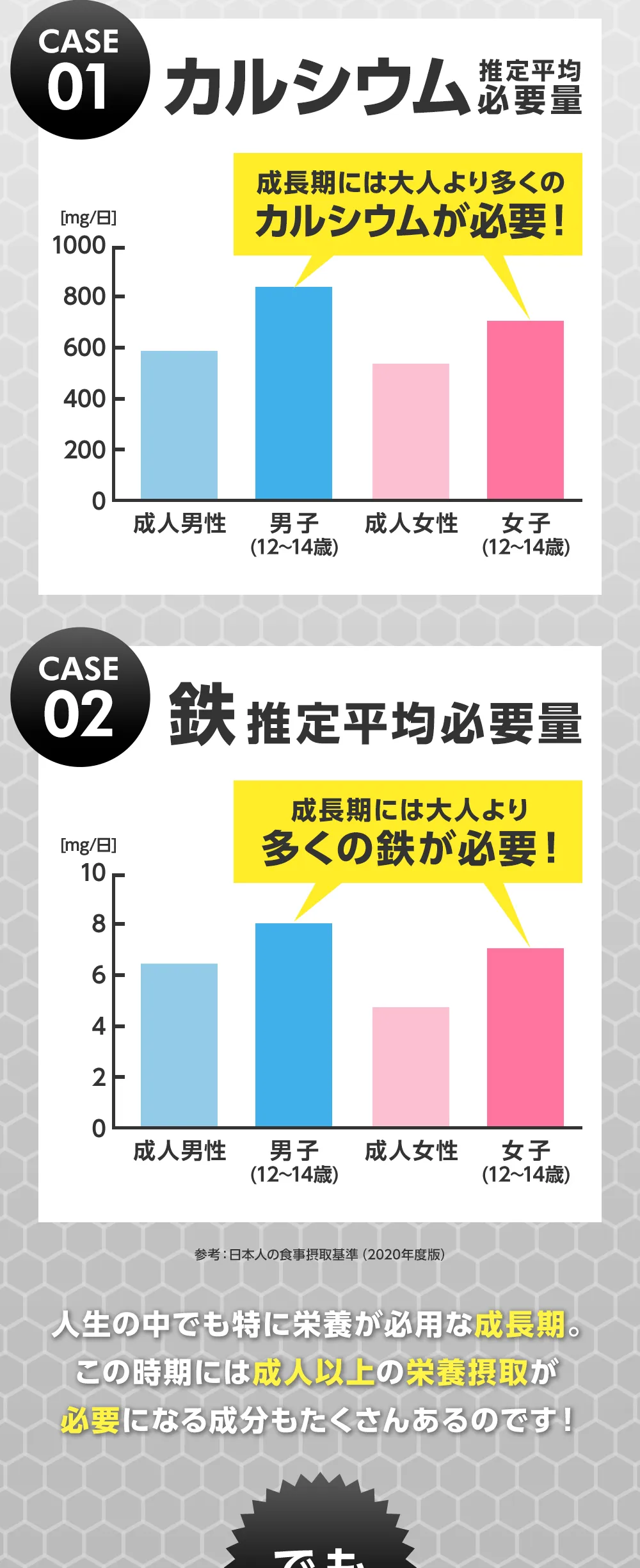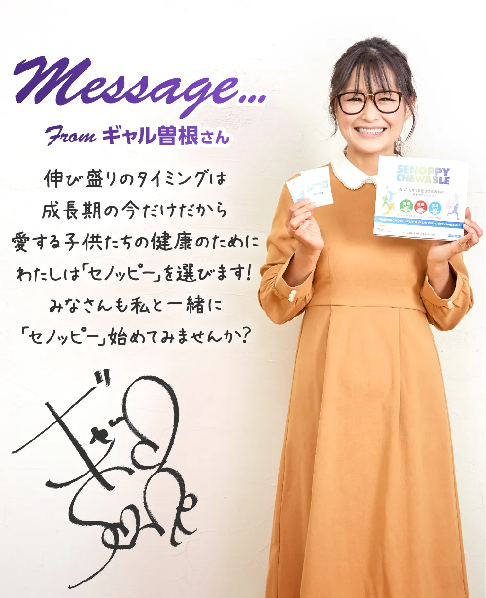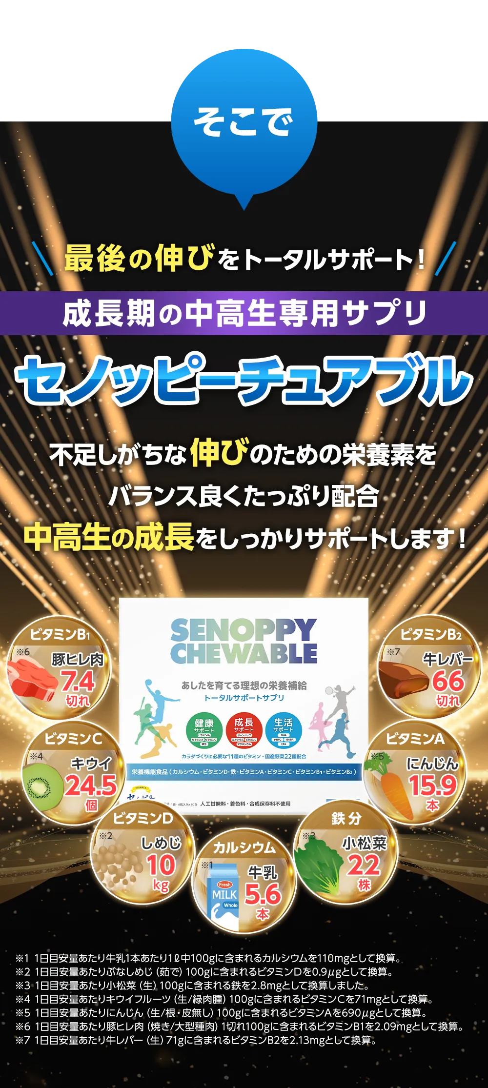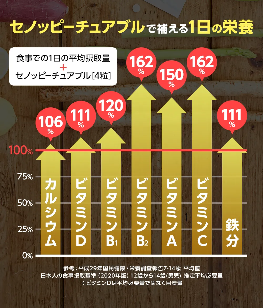ご利用上の注意 | 【カルシウム】カルシウムは骨や歯の形成に必要な栄養素です。 【ビタミンD】ビタミンDは腸管でのカルシウムの吸収を促進し、骨の形成を助ける栄養素です。 【鉄】鉄は赤血球を作るのに必要な栄養素です。 【ビタミンA】ビタミンAは夜間の視力の維持を助ける栄養素です。ビタミンAは、皮膚や粘膜の健康維持を助ける栄養素です。 【ビタミンB1】ビタミンB1は炭水化物からエネルギー産生と皮膚や粘膜の健康維持を助ける栄養素です。 【ビタミンB2】ビタミンB2は皮膚や粘膜の健康維持を助ける栄養素です。 【ビタミンC】ビタミンCは皮膚や粘膜の健康維持を助けるとともに、抗酸化作用をもつ栄養素です。 |
