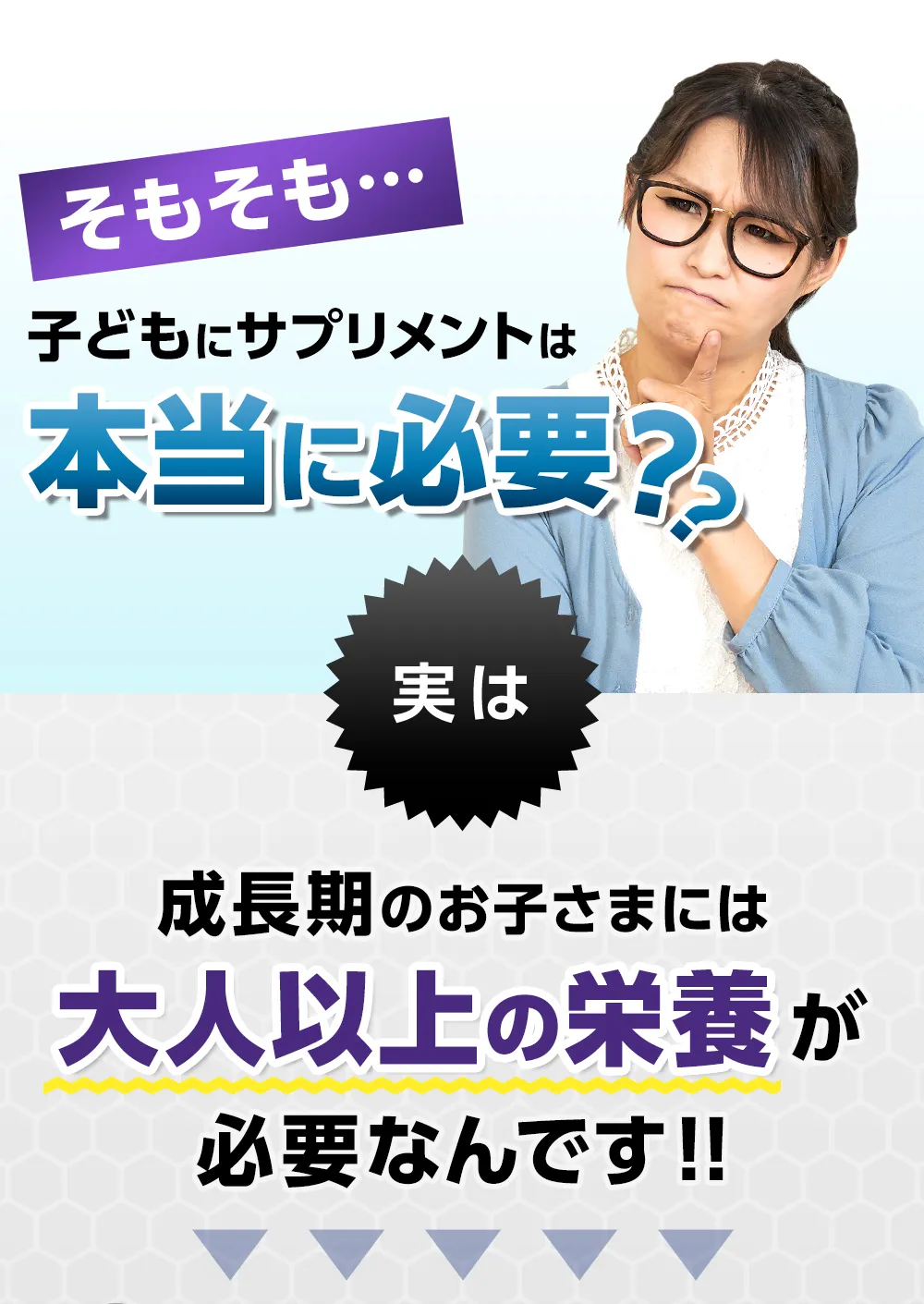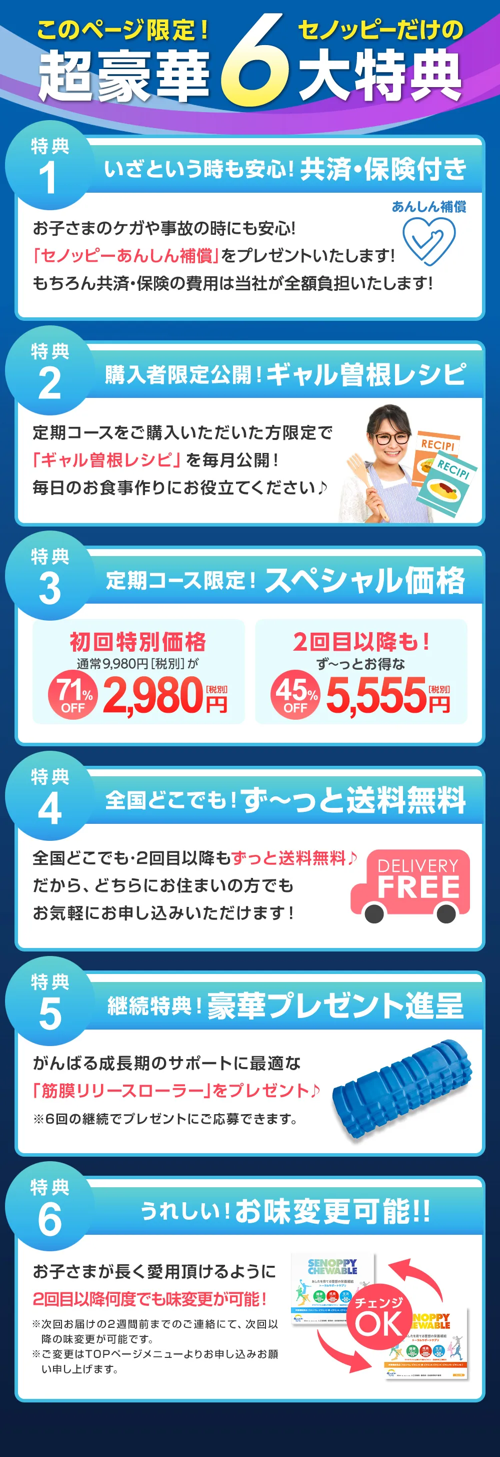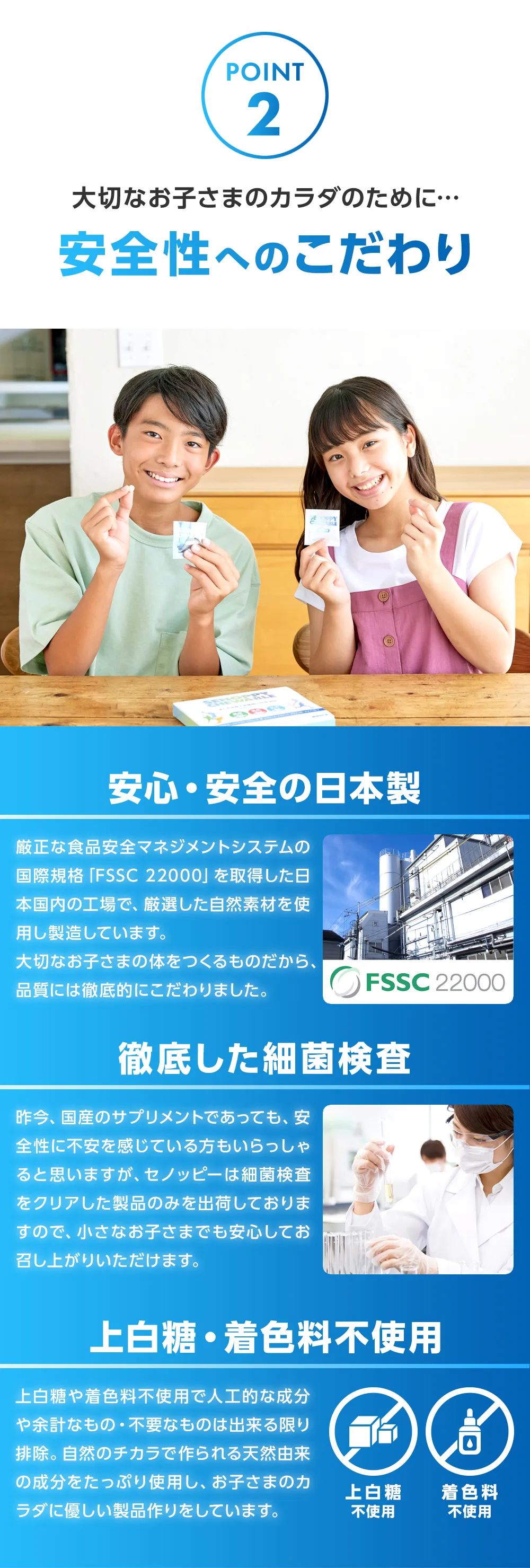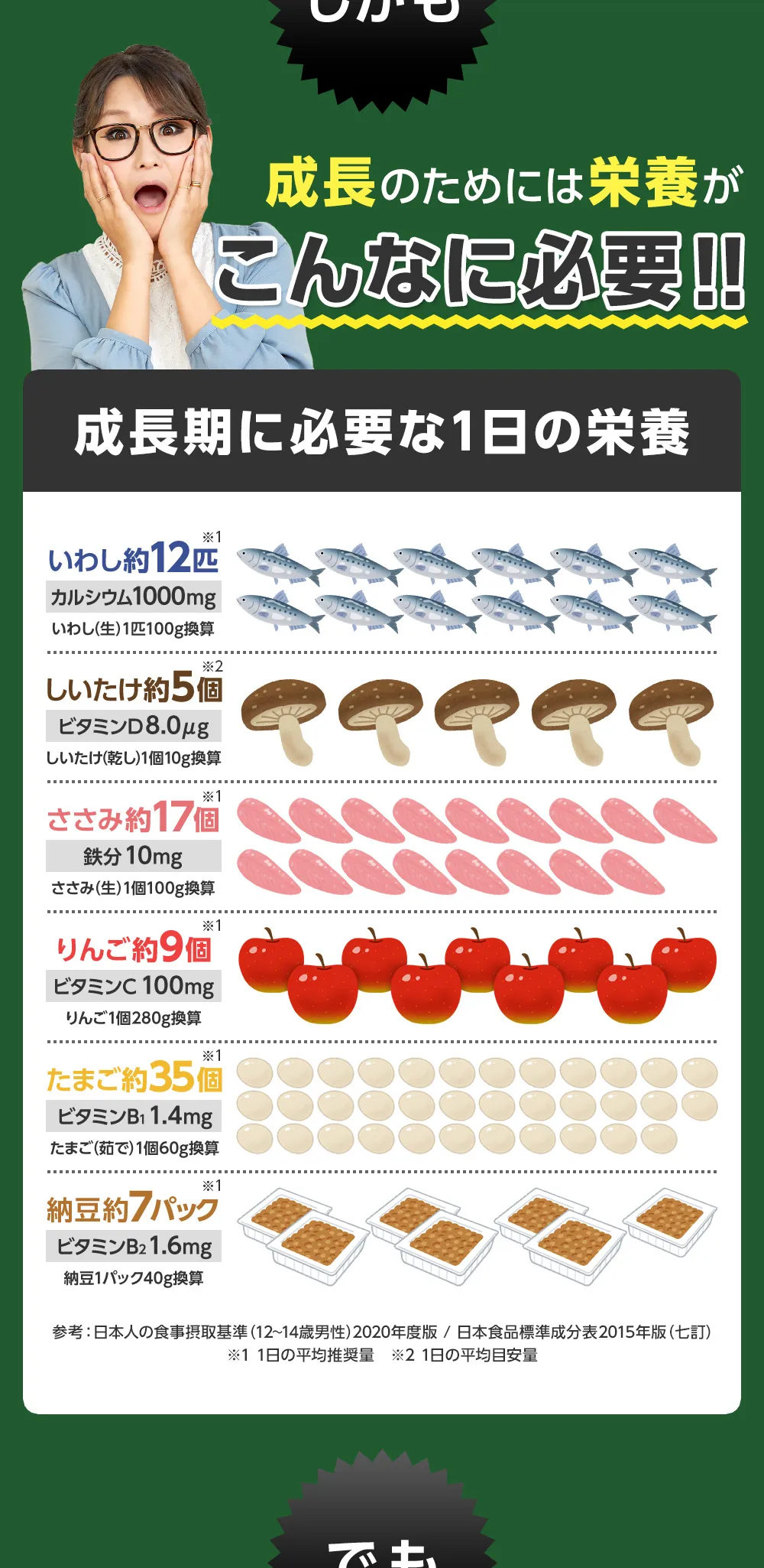 ご利用上の注意 | 【カルシウム】カルシウムは骨や歯の形成に必要な栄養素です。 【ビタミンD】ビタミンDは腸管でのカルシウムの吸収を促進し、骨の形成を助ける栄養素です。 【鉄】鉄は赤血球を作るのに必要な栄養素です。 【ビタミンA】ビタミンAは夜間の視力の維持を助ける栄養素です。ビタミンAは、皮膚や粘膜の健康維持を助ける栄養素です。 【ビタミンB1】ビタミンB1は炭水化物からエネルギー産生と皮膚や粘膜の健康維持を助ける栄養素です。 【ビタミンB2】ビタミンB2は皮膚や粘膜の健康維持を助ける栄養素です。 【ビタミンC】ビタミンCは皮膚や粘膜の健康維持を助けるとともに、抗酸化作用をもつ栄養素です。 |
