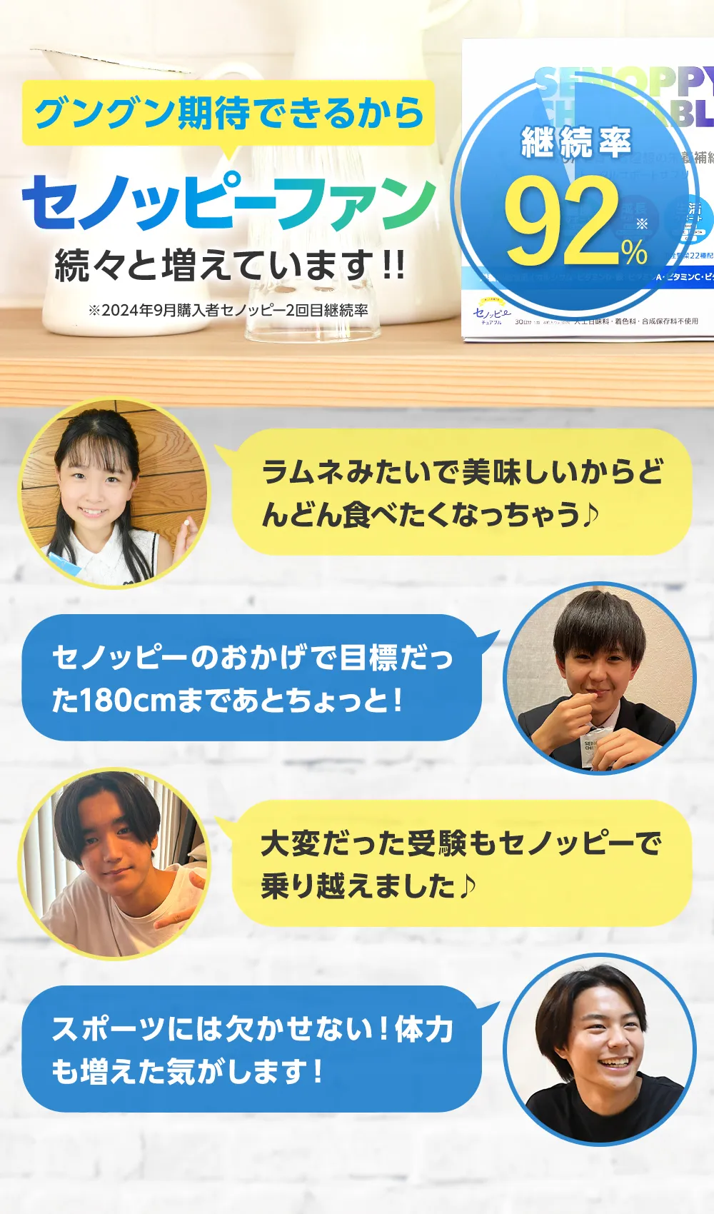 原材料名(ヨーグルト味) | 粉末還元麦芽糖水飴(国内製造)、食用焼成魚骨粉、クリーミングパウダー(デキストリン、植物油脂、乳糖、脱脂粉乳)、国産野菜ミックス(オクラ末、キャベツ末、ケール末、ニンジン末、カボチャ末、ゴボウの根末、紫イモ末、サトイモ末、シイタケ末、ブロッコリー末、アシタバ末、アスパラガス末、枝豆(大豆)末、コマツナ末、セロリ末、ダイコン末、ダイコン葉末、タマネギ末、パセリ末、ホウレンソウ末、レモン末、レンコン末)、ギャバ含有乳酸菌醗酵エキス、ラフマ葉抽出物、L-オルニチン塩酸塩、L-シトルリン、卵黄ペプチド、α-GPC 加工食品、DHA 粉末/結晶セルロース、ステアリン酸Ca、香料、ビタミン C、クエン酸、微粒酸化ケイ素、甘味料(ステビア)、抽出ビタミン E、ナイアシン、ピロリン酸第二鉄、カゼインナトリウム、pH 調整剤、乳化剤、ビタミン A、L-アルギニン、酸化マグネシウム、セルロース、ビタミン D、ビタミン B2、ビタミン B1、ビタミン B6、酸化防止剤(ビタミン E)、葉酸、キサンタンガム、ビタミン B12、(一部に乳成分・卵・大豆を含む) |